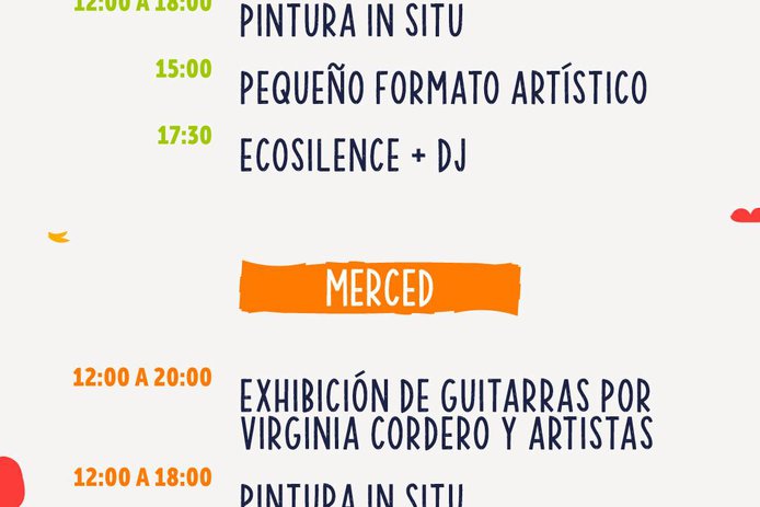En Merced durante todo el día habrá exhibición de guitarras por Virginia Cordero y artistas y muestra de pinturas. Mientras que en los alrededores habrá stands de artesanía, diseño, gastronomía, productos locales y música ambiental.