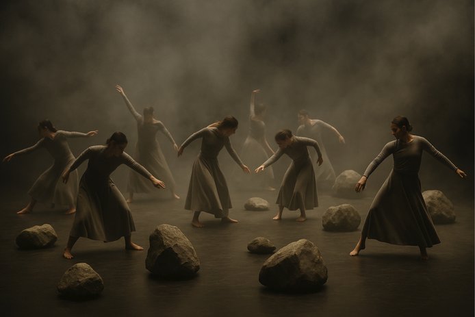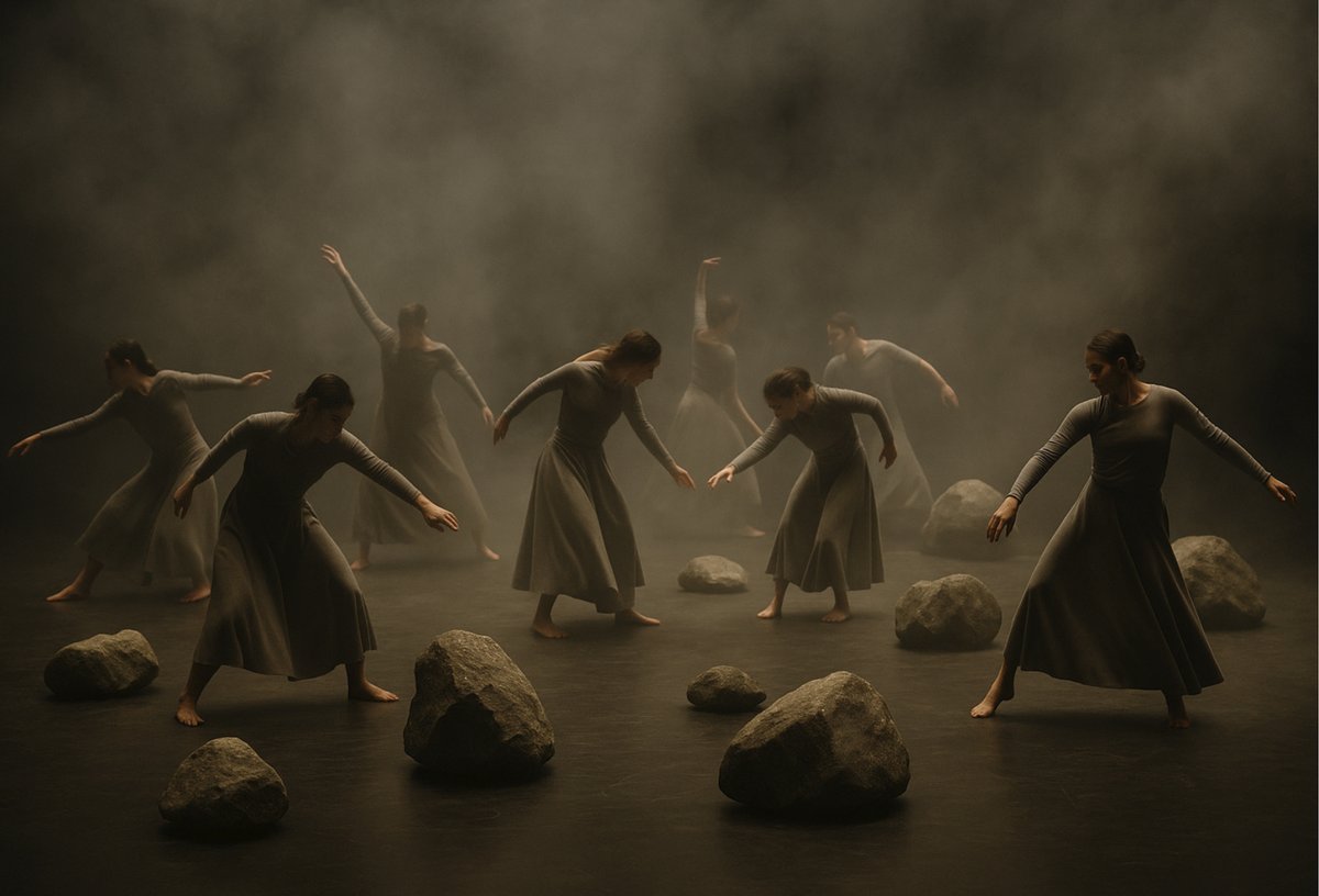 Lo que hace a este montaje algo único es su interacción con la materia cruda: piedras, arenas volcánicas y rocas actúan como agentes escénicos. Los cuerpos friccionan, cargan y habitan un paisaje tectónico que transforma el escenario en un territorio geológico.