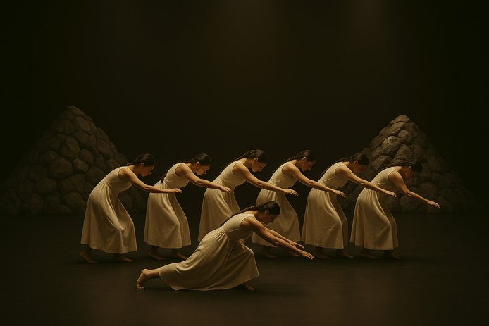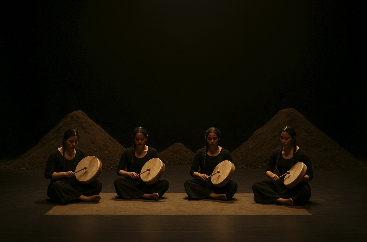 Doce intérpretes femeninas despliegan una gestualidad que la obra define como amukan rüpü mew (viajera del camino), moviéndose entre la expansión y la vibración mineral.