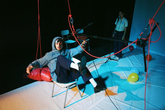 Esta obra presenta sonidos retumbantes, estridentes y repentinos y algunas explosiones de globos.